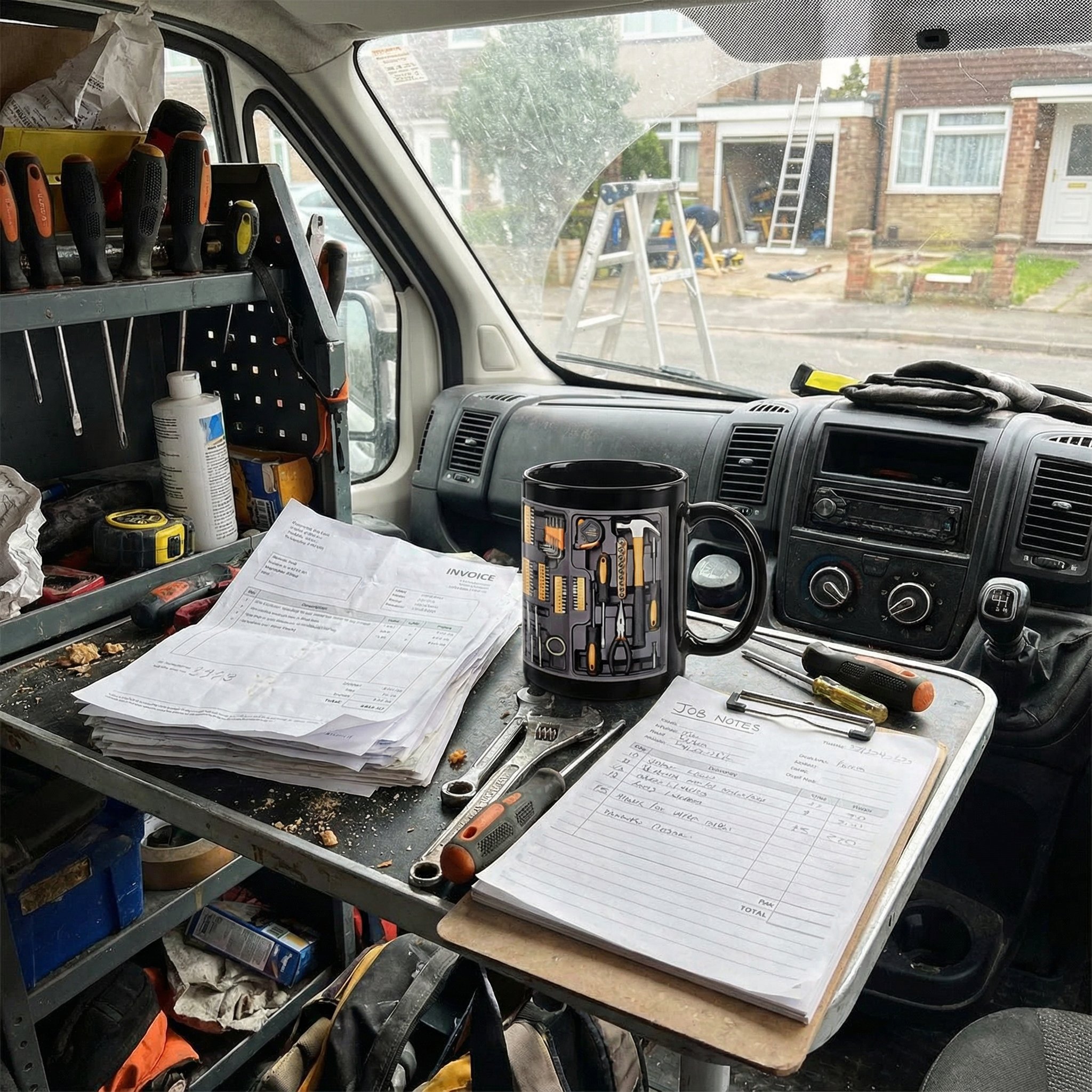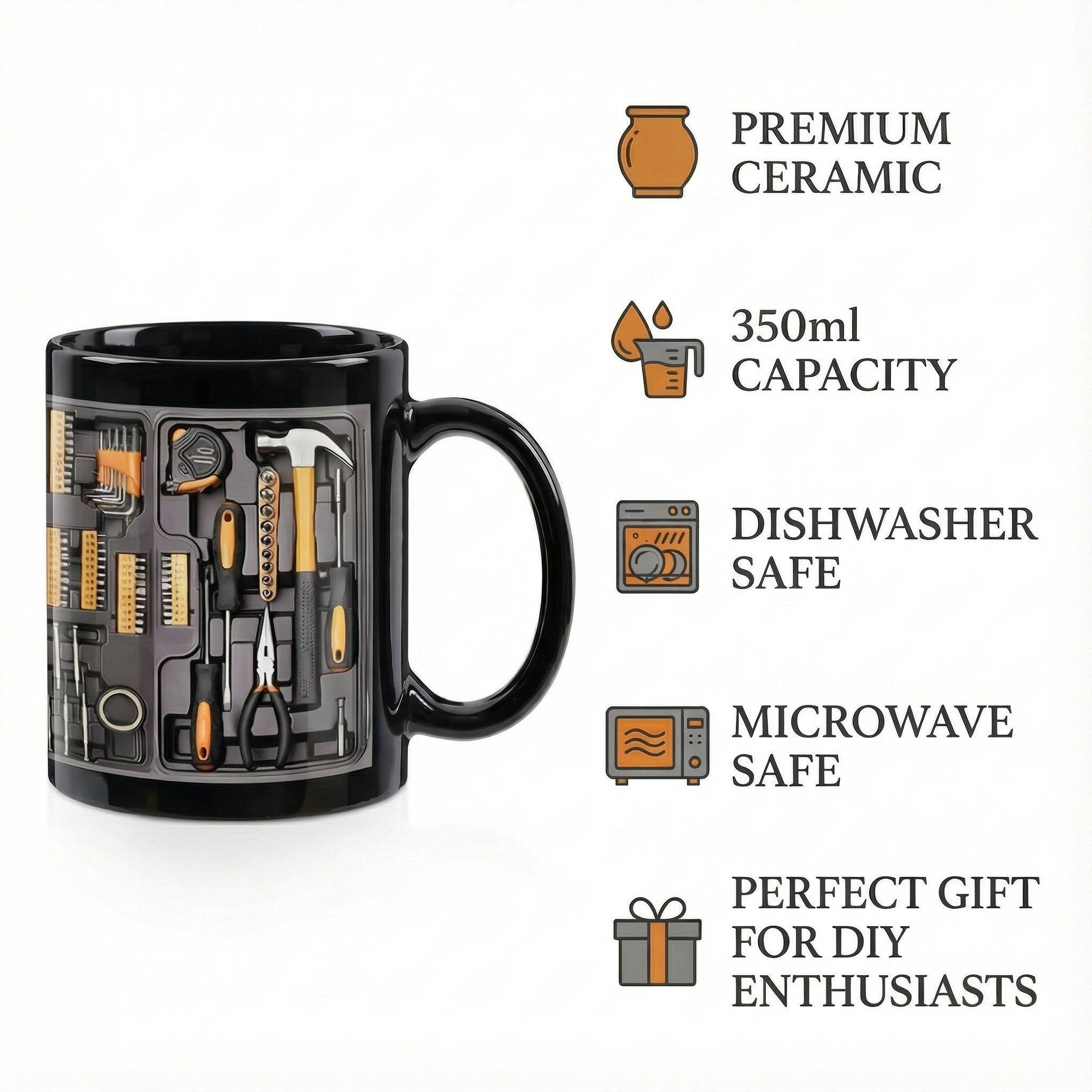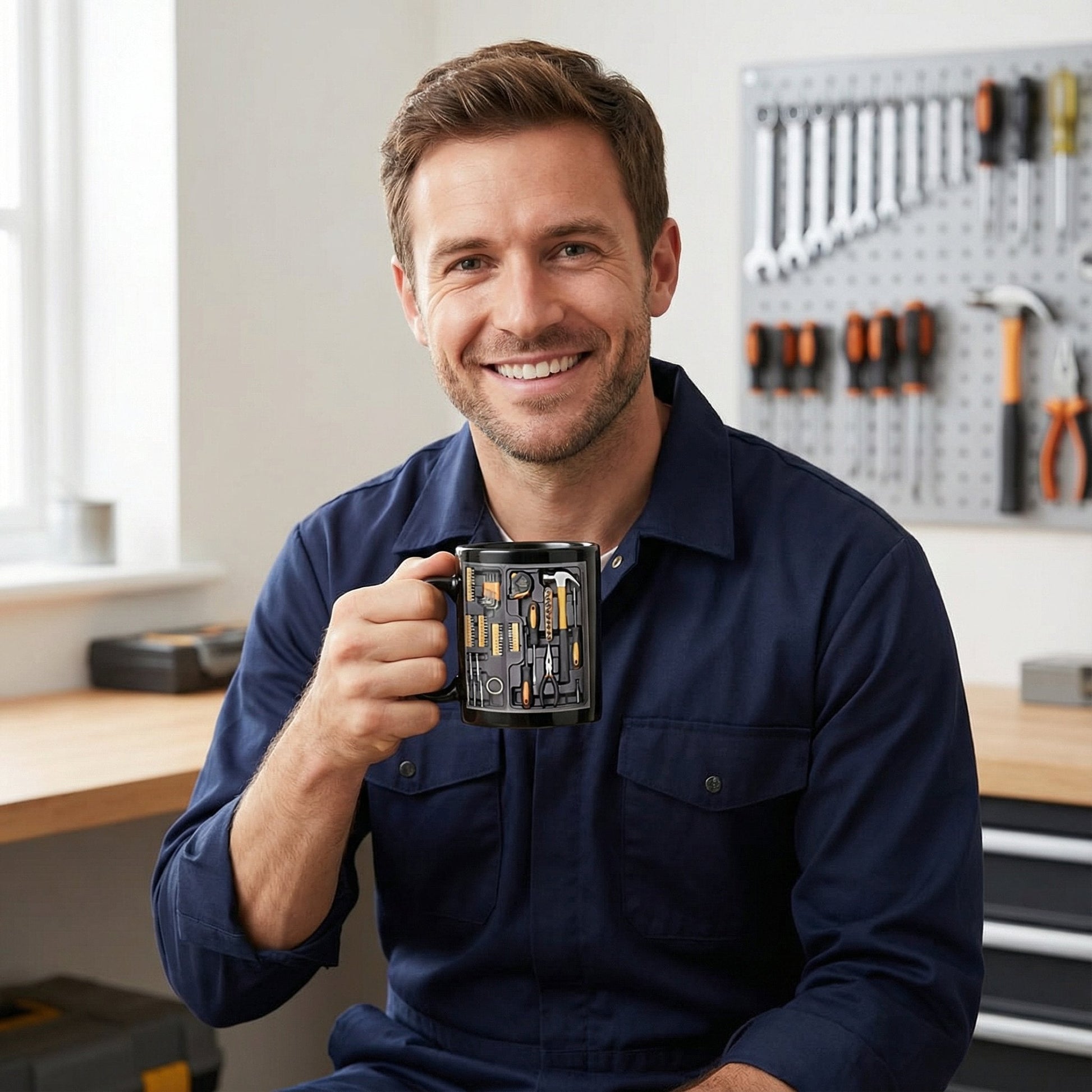 Crafted as a playful 2D toolbox replica – complete with spanners, screwdrivers, and spirit levels – this mug brings gentle workshop humour to your morning brew. Perfect for mechanics, DIY enthusiasts, and tinkerers who appreciate clever design.