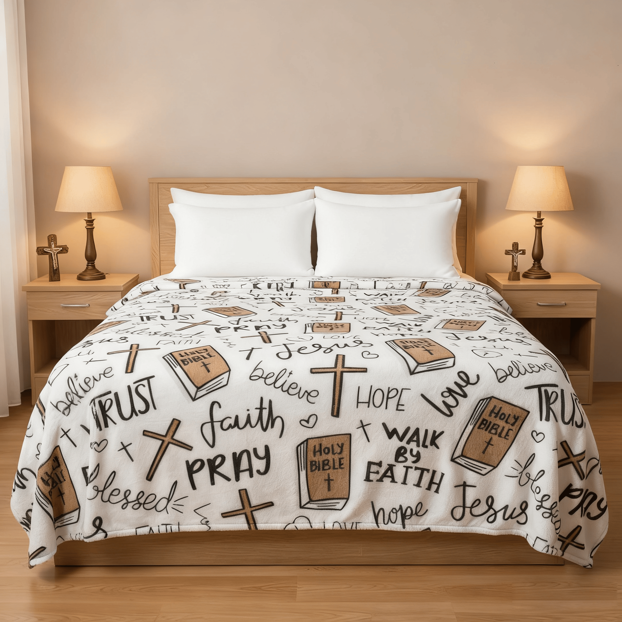 Each blanket is thoughtfully designed with Bible verses, Jesus imagery, and Christian symbols—a comforting reminder that you are held, guided, and never alone. It’s a piece of home décor that speaks to the heart.