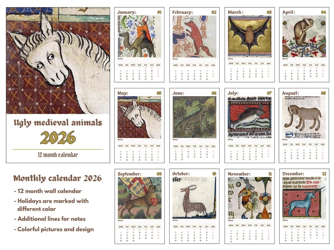 Introducing our hilarious 2026 Wall Calendar, where 12 medieval animals take center stage in a series of humorous and funny medieval paintings!
